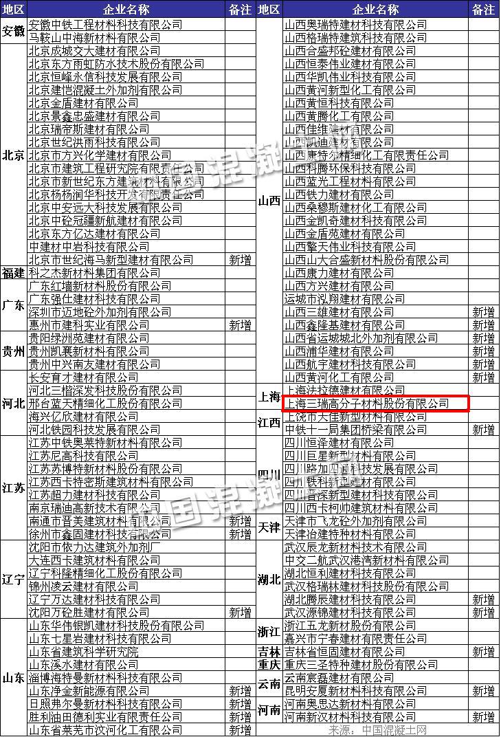 根据中国混凝土网的统计,截止到2015年9月30日,一共有109家减水剂生产企业通过了铁路减水剂产品认证并获得产品认证证书。上海三瑞高分子材料股份有限公司已连续几年通过CRCC认证,并在京沪、成贵、杭黄、沪通、瑞九等高铁项目中获得广泛应用。