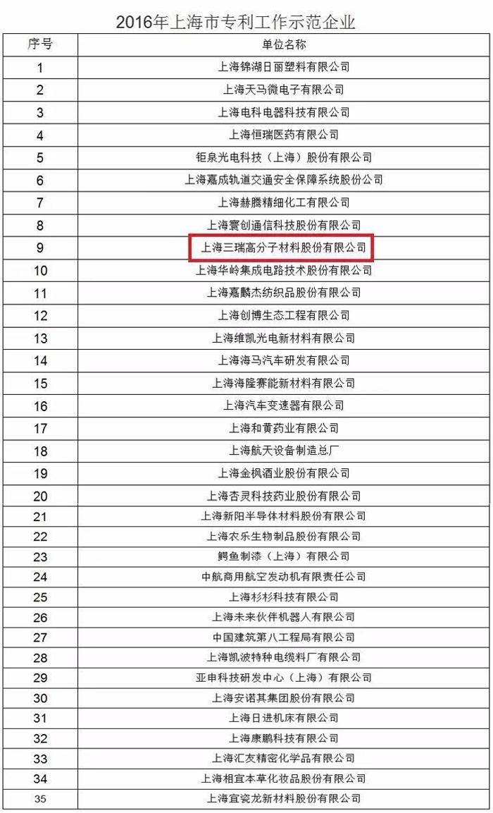 近日,经徐汇区科委择优推荐、上海市知识产权局组织评审讨论,上海三瑞高分子材料股份有限公司被正式评为“2016上海市专利工作示范企业”。本次评选竞争异常激烈,三瑞高材从上百家企业中脱颖而出,以高分跻身于35家“2016年上海市专利工作示范企业”行列中。