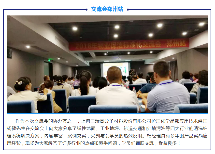 8月22日,由郑州凯塞清洁设备有限公司主办,上海三瑞高分子材料股份有限公司、广东佛山清洁设备有限公司协办的2018物业、保洁标准化培训交流会在中原大地——郑州成功举办,吸引了众多同行、嘉宾和朋友前来探讨交流。