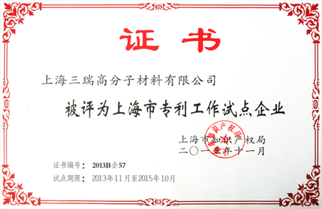 2013年6月上海市开展了第一批专利试点示范企业评定活动,根据《上海市企事业专利工作试点示范单位认定和管理办法(试行)》(沪知局[2012]133号,经过专家评审、协调小组讨论协商、市知识产权局局长办公会审议、网上公示等程序,上海三瑞高分子材料有限公司凭借规范的专利管理体系和突出的专利工作成绩,在众多企业中脱颖而出,被认定为获评为上海市专利工作试点企业。截至2014年6月底,我公司在建筑外加剂领域共申请发明专利80余项,其中获得授权发明专利40多项,其中在聚羧酸领域,专利拥有量在企业单位中排名第一。