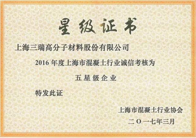 为了加强与提高上海混凝土企业产品和服务质量,上海市混凝土行业协会组织开展了二0一六年度上海市混凝土行业“诚信杯”评审活动。三瑞高材从参与本次考评的百家外加剂企业中脱颖而出,荣获上海市混凝土行业 “诚信杯”五星级混凝土外加剂企业。