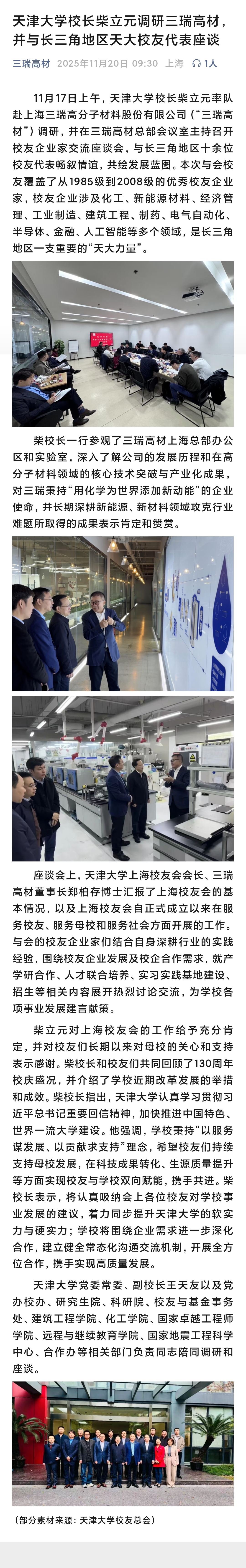 天津大学校长柴立元调研三瑞高材 2025/11/17 2025年11月17日上午,天津大学校长柴立元率队赴上海三瑞高分子材料股份有限公司(“三瑞高材”)调研,并在三瑞高材总部会议室主持召开校友企业家交流座谈会,与长三角地区十余位校友代表畅叙情谊,共绘发展蓝图。